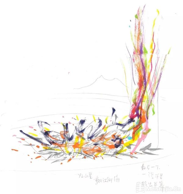 约30米的巨大画布上随意堆放与二千年前庞贝艺术、生活相关的石膏、湿壁画板、布料、陶瓷、玻璃器皿、大理石等材料,并与当地烟花公司合作,埋藏捆绑各种烟花弹和喷管,与彩色、黑色原生火药。点燃引线,想象瓶罐间掀起狂轰滥炸,仿佛火山深处熔岩翻腾;随即数百发烟花突然同时射向画布,如火山喷发势不可挡!最后一切归于平静。余烟中,艺术家与团队从一片狼籍的遗址里,默默“考古”挖掘被炸过的件件作品。爆炸事件,依稀是千年岁月里,庞贝古城被维苏威火山喷发的吞没和发掘。整个过程将开放给民众和媒体观赏。