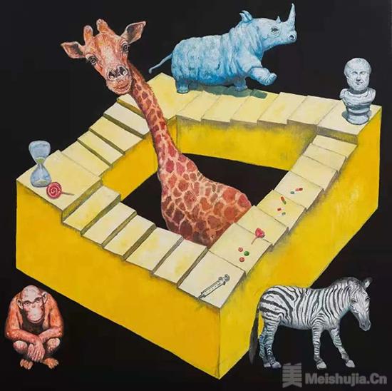最近两年来的创作,随着心智和心境的变化,华庆的作品出现了积极的改观:过去高冷、孤独的类人猿,纵身一跃投入了广阔的大千世界;耽于思虑和独行的造型,也随着时代背景的扩大而与各种生命展开了姿态各异的热烈互动;自然而然,平涂技法开始逐渐取代表现性的笔触。