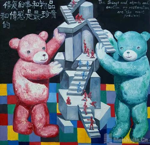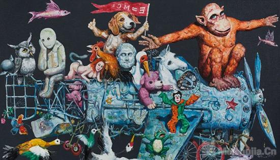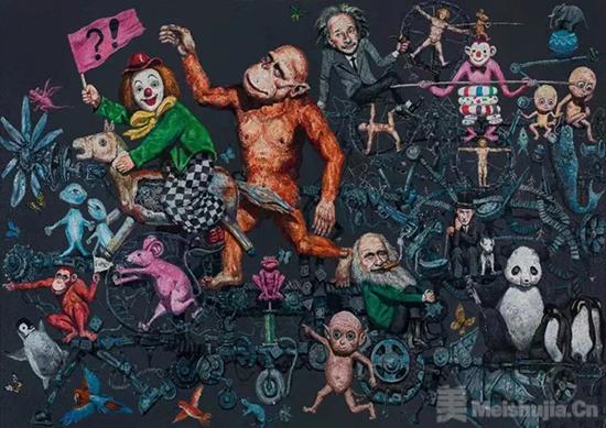 此次展出的《永动机》《人的童话》和其他4张近作,就是这个转型系列的代表性作品。在这些作品中,集中体现了华庆崭新的视角、繁复的营造和外界对其心理投射的反应。重返人间烟火或更接当下地气的艺术取向,表达出艺术家对中国社会的敏感度和价值观:在动态(如永动机、共享单车等)的载体上,无数的生命饱受不可控因素(如疫苗及其产物大头娃娃)的侵扰,但仍思忖、分辨、行动着,用最大的能量合奏出一曲包含质疑在内的史诗般的交响!事实上,艺术家创造出的这个活灵活现的场景,就是我们置身其中的中国场景:我们共同搭乘在同一辆时代快车上。而早期作品中单一类人猿和爱因斯坦“我们是谁?我们从哪里来?我们到哪里去”的发问,则因为“我们”的介入,更加饱满和响亮!