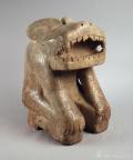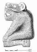 石立雕为屈膝跪坐的虎首人身造型,手呈爪状置于两膝上,全身布满阴刻纹饰,双臂为瓶角龙纹,腿至臀部则为直立翘尾龙纹。器物底部中分为二,背面有一竖凹槽,推测可能是嵌入木结构建筑上的装饰附件。
