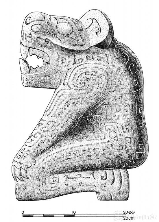 这件大理石虎首人身立雕高37.1厘米,重28.5公斤,石质晶莹、雕刻细致,充分显现殷代大理石工艺的发达,是殷墟出土器物中最为精美的石雕之一。