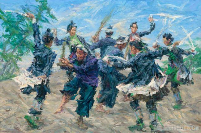 谢东明的艺术始终扎根于对生命本真的叩问。他喜欢用大笔、刮刀饱蘸颜料作画,笔触狂放有力,让土地的记忆、阳光的震颤与人类的欢愉在画布上共生。他深入独龙江的深谷、黄河源的雪野、藏地的牧场,将画笔浸入未被现代性侵染的生命现场。那些被定格的瞬间——山民疾行的背影、藏族女孩的微笑、林间跳跃的少年——无不饱含对质朴存在方式的深切羡慕。正如他所言:“我画的是阳光下最本真的人,他们的幸福在于与自然的天性相依相存。”《欢乐家园》中沸腾的喜悦,正是这种信仰的巅峰呈现:当人们在大自然中欢乐的舞蹈,艺术便成为对生命原力的永恒礼赞。