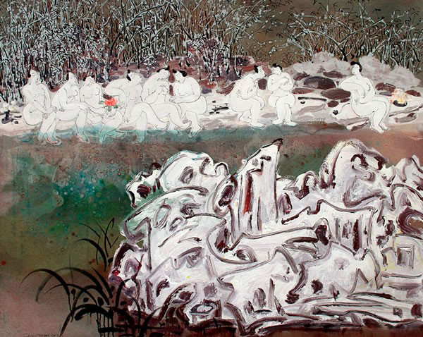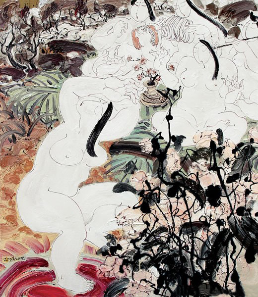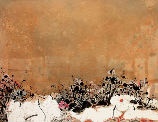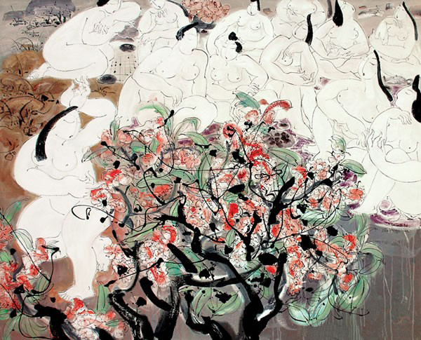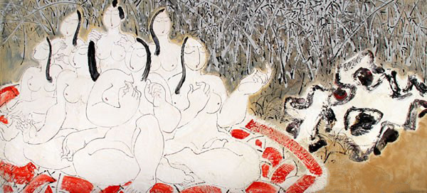 她要寻求一种水墨趣味的想法是清晰的。她在画面上用了大量的“墨色”,并用勾勒的手法以线造型,这些做法都在试图引导人们回归到水墨的经验之中。但她的艺术真正接近传统的还不是简单的外在的形式和风格特征,而是她内心所渴望的一种亲近自然的诗意情怀。赵梦歌的绘画主题基本可以概括为“自然与人”。人作为自然的一部分(剥去服装的裸体可视为无法识别社会身份的“自然人”)理应融入自然,与自然和谐相处。所以她笔下的人除了与自然所构成的一种“亲和关系”,没有任何实质性的举动,她画的场景大多不是具有真实情节的场景,人与人之间也不存在任何差异,她们一律地体态丰韵、肌肤白皙、举止优雅,慵懒、闲适而性感,她们只是作为一种精神符号而存在。特别是,她们时而作为主体呈现在自然的背景之中,时而又被“虚化”为类似水墨画的“空白”,像似背景一般衬托着作为主体的自然。在赵梦歌的作品中,人与自然的这种不知谁是主体、谁是陪衬的关系,才是一种真正的“天人合一”的境界。