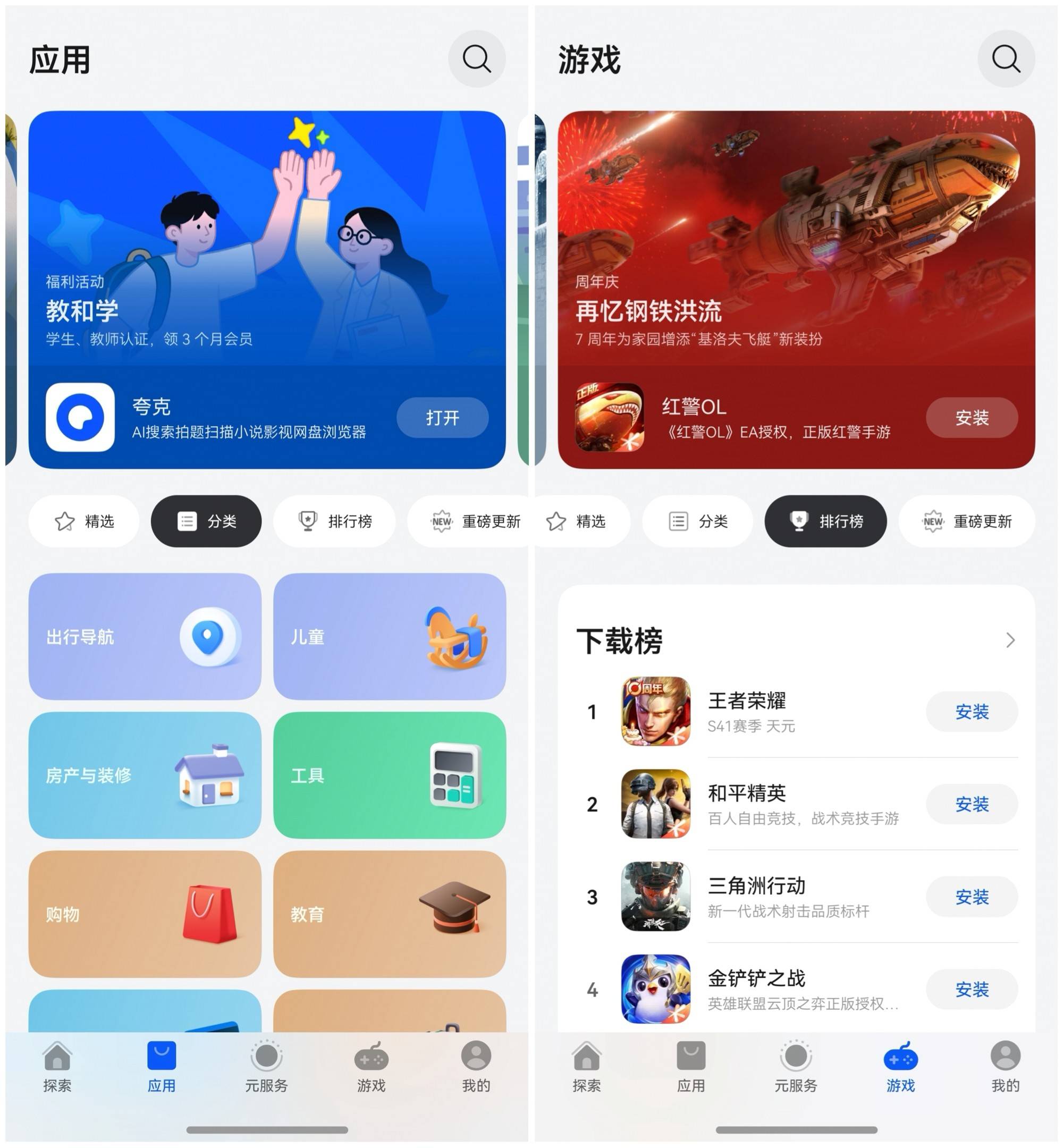 体验路径:打开AppGallery,在“应用”或“游戏”页,点击腰部的“分类”或“排行榜”查看