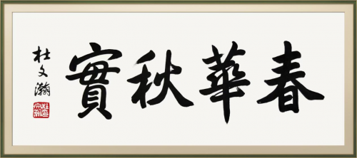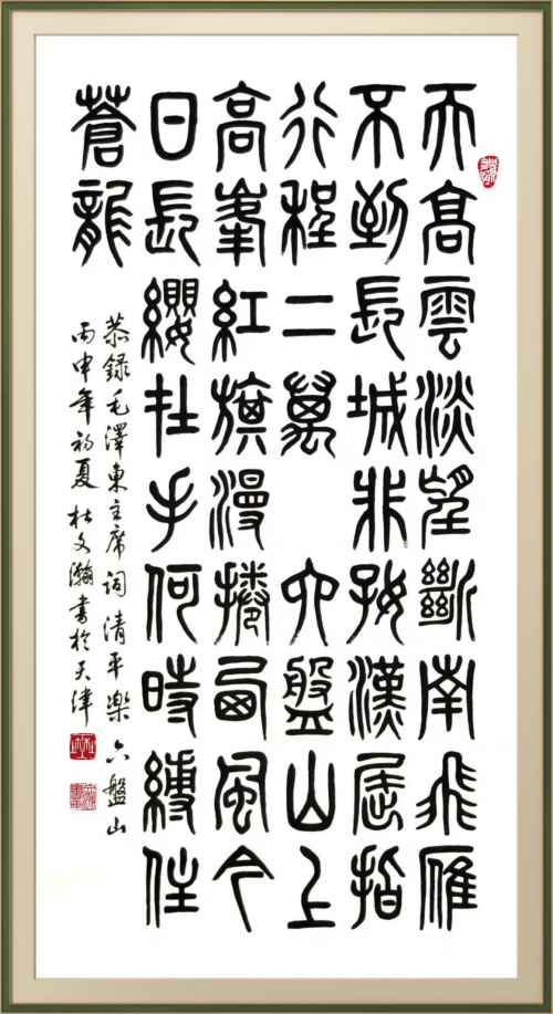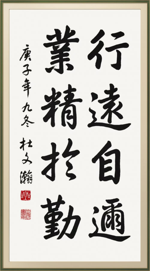 杜文瀚的书法,是扎根传统沃土、又绽放时代新姿的艺术瑰宝。他以敬畏之心追溯书法本源,上追秦汉魏晋的雄浑气象,遍临历代名家碑帖,将钟鼎文的古朴、汉隶的庄重、晋帖的飘逸熔铸于笔端,练就了深厚扎实的笔墨功底,这份对传统的深耕,正是其作品能兼具历史厚重与艺术张力的根基。