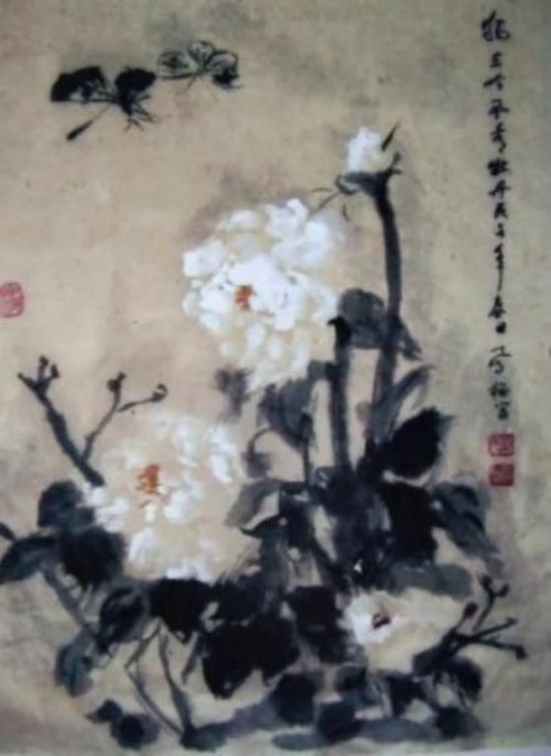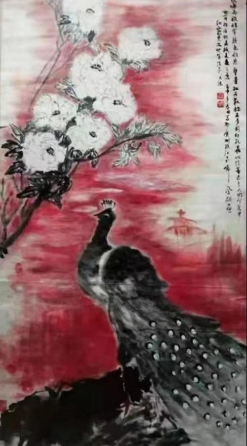 黑孔雀:站在山坡上对着白牡丹,远处有朦胧的庙宇。