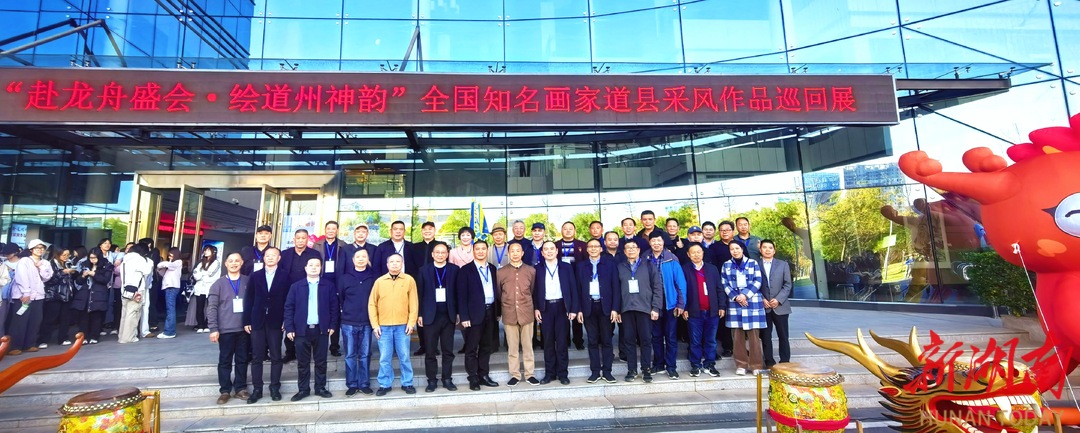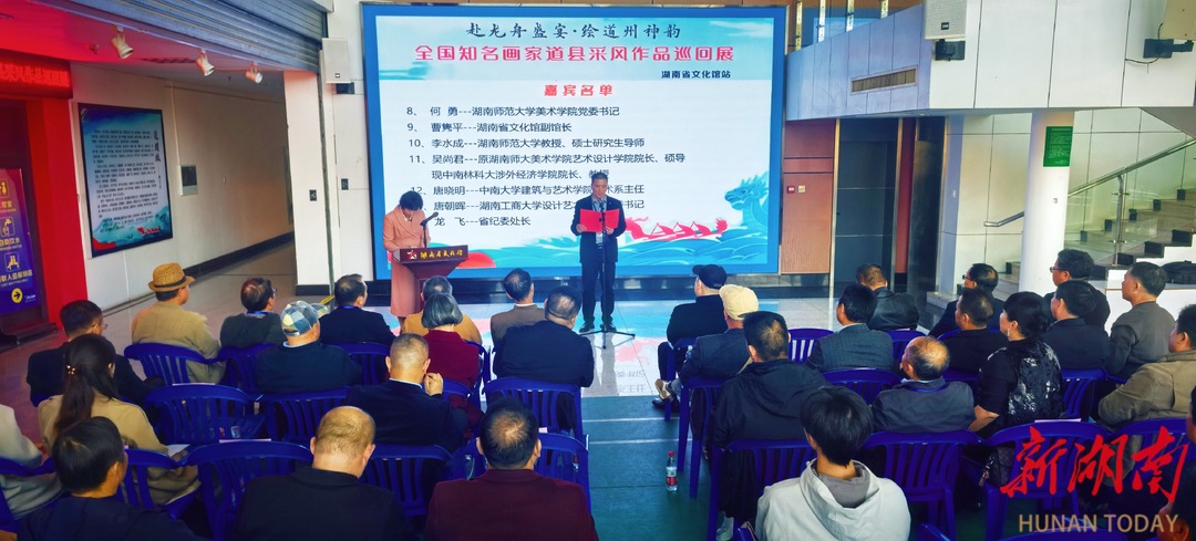 11月30日下午,湖南省文化馆东门一楼大厅鼓乐齐鸣、号子震天,“赴龙舟盛会·绘道州神韵”全国知名画家道县采风作品巡回展(湖南省文化馆站)在此开幕。80余幅凝聚全国60余位知名画家心血的写生力作联袂亮相,与非遗龙舟实物交相辉映,构成一条“可行走、可沉浸”的潇水画卷。