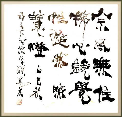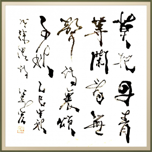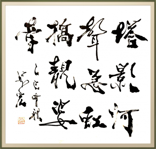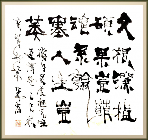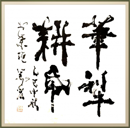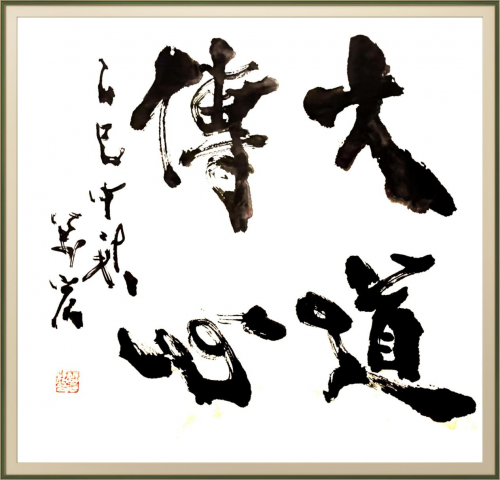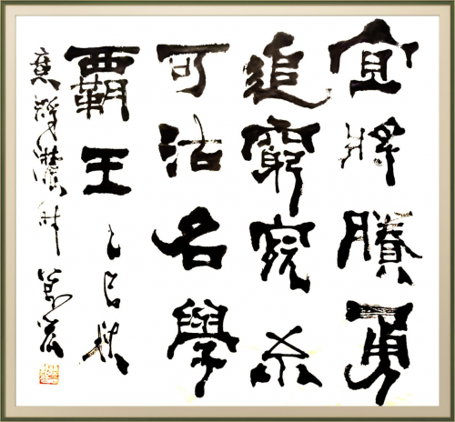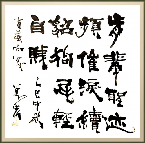 先生的艺术成就,在于熔古铸今的创新与坚守。他兼擅十体,从甲骨文的古朴、金文的厚重,到汉隶的端庄、今草的纵逸,皆能得心应手,其《十体千字文》便是这份功底的极致展现;他印艺精深,《中国史纲印谱》以印证史,尽显文史底蕴。清华美院李小龙教授赞其“提按顿叩击山河、张驰疾气势磅礴”,恰是先生书风的生动写照——既有传统笔墨的骨力,又有时代精神的气韵。这份成就,换来了“国际奥林匹克艺术家”“一代宗师”“中国美术终身成就奖”等诸多殊荣,更让他成为“中国文化艺术国际传播大使”,在“一带一路”文化交流中传递中国笔墨之美。