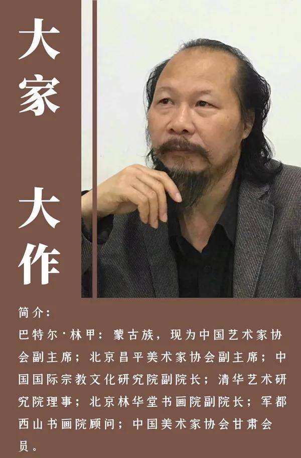 巴特尔·林甲:蒙古族,1970年10月10日生于新疆博尔塔拉蒙古自治州,毕业于清华大学美术学院油画研究生班,现为中国艺术家协会副主席;北京昌平美术家协会副主席;中国国际宗教文化研究院副院长;清华艺术研究院理事;北京林华堂书画院副院长;军都西山书画院顾问;中国美术家协会甘肃会员。
