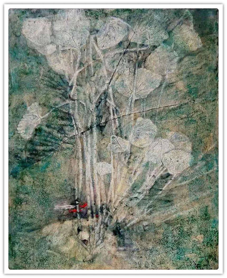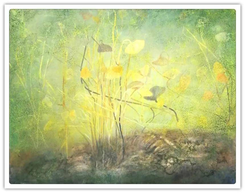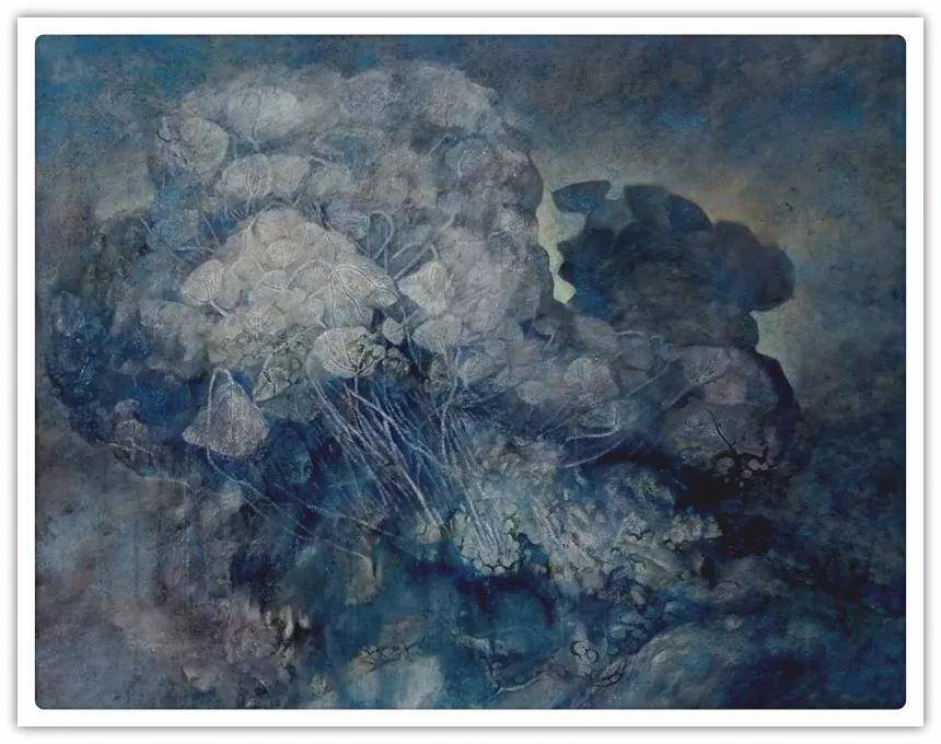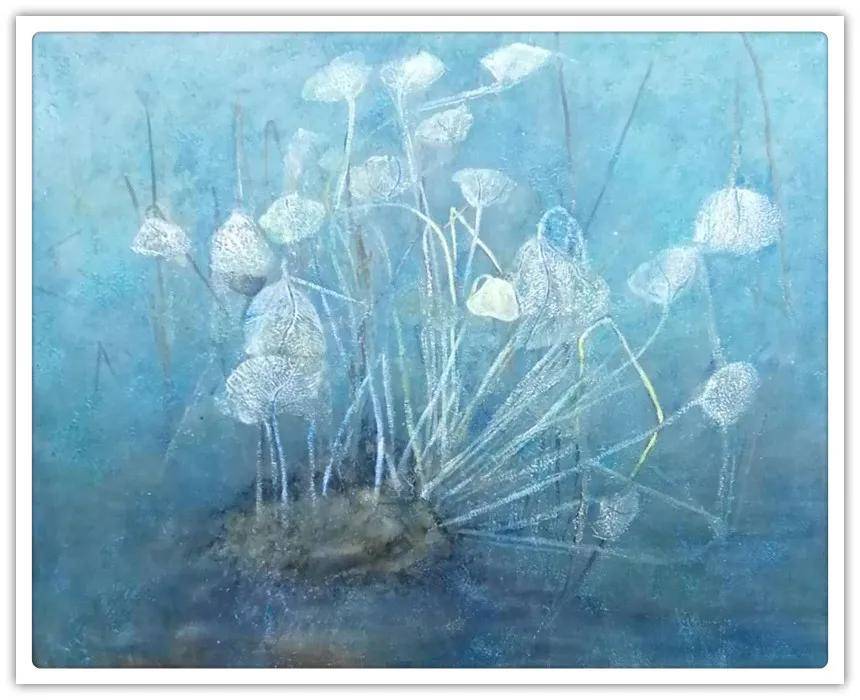 他是海百合的知音,把这种生物的生态进化视为人文内涵的寓言。知之为深,画之为神,把这一独特的物象酝酿成人文画题的独特。一叶一花总关情,流丽朴茂寓哲思,用岩彩画海百合,突出了色彩的质感和动感,极致地渲染出光影下物象的神秘感,光感奇幻,统摄心灵。