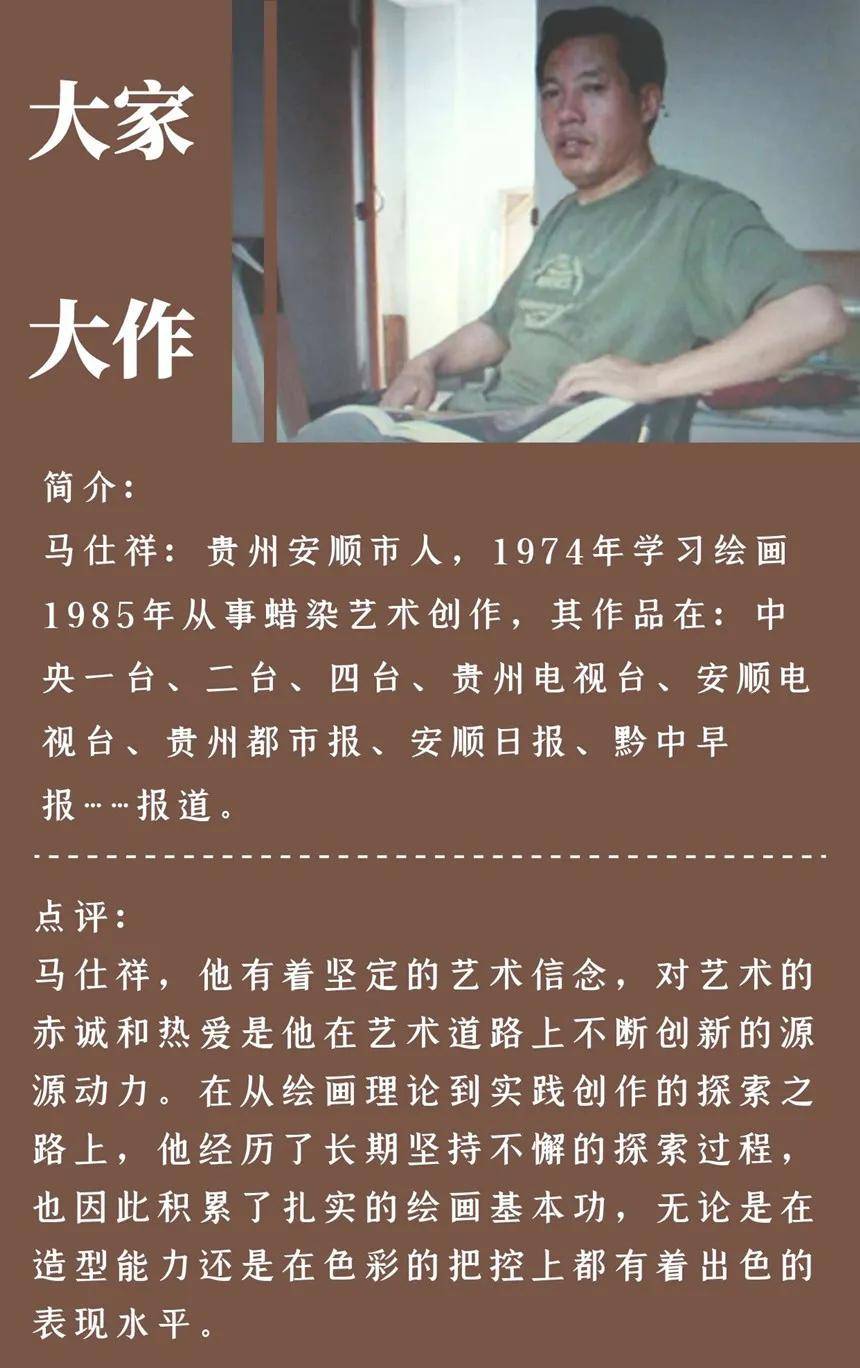 马仕祥:贵州安顺市人,1974年学习绘画1985年从事蜡染艺术创作,其作品在:中央一台、二台、四台、贵州电视台、安顺电视台、贵州都市报、安顺日报、黔中早报……报道。2006年从事油画写生创作。2008年举办《马仕祥风景油画作品展》,2010年就读于中国美院。2012年受台湾东海大学邀请参加《丹青风华两岸胶彩.岩彩画学术交流展》,2013年在《和平颂.钓鱼岛抒怀书法绘画中》文化部指导中国文化管理学会、艺术研究工作委员会授予“中国爱国艺术家”称号,同年荣获“贵州省特别奉献美术家”称号。2014年安顺市文联授予“第二批艺术名家马仕祥工作室》称号。