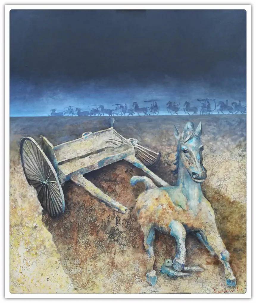 意象唯妙,独树一帜。青铜器也是马先生琢磨的又一个独特画题。因有琢磨,所以他画青铜首先对青铜文化有一个非常体系的把控水准。有考古、考证方面的深厚积淀,文化修养在其前,然后执笔画青铜,画得不仅仅是器物的精彩,还有文化的丰满,让每一幅青铜作品,都拥有了文化的性灵,让人目游其间,可以有今之视昔亦如后之视今的感叹!唯有在文化层面有与众不同的修养,才可以让绘画创新拥有独树一帜的独特文化表现!