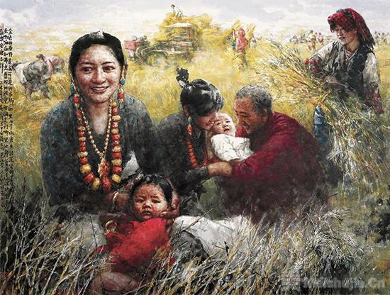 从20世纪90年代初期的传统水墨人物画,到21世纪之后以彩墨展现丰富群像记忆的藏族人民题材作品,我们可以明晰地看到南海岩在逐渐超越传统水墨画的固有形式,在以传统宣纸为载体的传统水墨画的基础上,嫁接西方古典写实技巧,造型突出体积感,笔墨叠积厚实,试图强化画面中光与色的表现力,以酣畅的笔墨、浓酽的色彩、若隐若现的线条、厚重坚实的造型突出表现藏族人民的人文形象与人文精神。