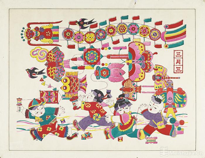 《三月三》是一幅创作于1984年的年画作品。年画作为中国传统文化的重要组成部分,它的题材广泛、色彩艳丽,是中国老百姓在日常生活中喜闻乐见的艺术表现形式。