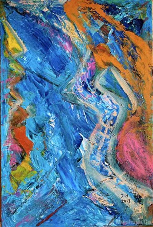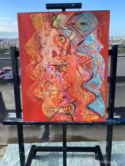 她的“新东方抽象”系列以破坏性笔法重构东方美学:色彩之间的碰撞,晕染的层次又暗合哲学的理念。“何君宏的抽象不是西方式的几何解构,而是东方哲学的视觉化——一种关于混沌、无常与和谐的当代诠释。”