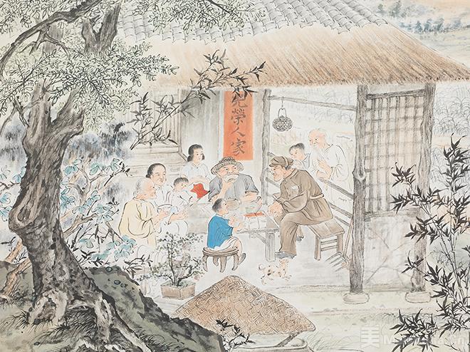 在“艺术为人民服务”的方针引领下,唐云以写生为核心,深入生活、扎根人民,他以革新者的姿态打破传统花鸟的题材局限,将棉花、谷子等题材入画,再现时代图景。在艺术语言构建上,唐云熔吴昌硕大写意的雄浑厚重与齐白石“妙在似与不似之间”的造型智慧于一炉,形成刚柔相济的艺术风格。这不仅是对传统文人画“逸笔草草”的超越,更是对劳动场景精神气质的艺术提炼。唐云以热烈明快的色彩“表现欣欣向荣的时代精神”,将旧社会的“雅俗共赏”升华为新中国劳动人民的喜闻乐见。除了花鸟之外,唐云这一时期的山水和人物也画得颇有新意和生活气息。