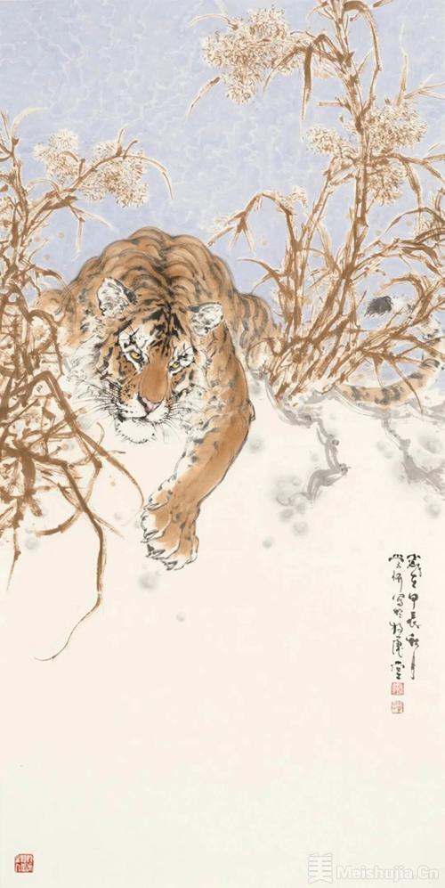 访各大动物园,进行观察写生、搜集素材,废寝忘食,朝斯夕斯,成了真正的当代“虎痴”。耕耘必有收获,近年其头角崭露,不仅屡屡入选大展、获奖,并多次举办个展,深获好评。