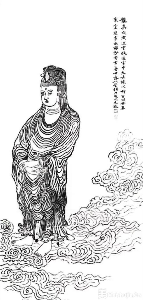 1998年,饶宗颐仿效唐代吴道子的画风,绘制了一尊白描观音像。这件作品肃穆而雅致,古典而创新,令观者有“万古长空,一朝风月”[1]的感觉。在饶宗颐绘制的众多佛菩萨画像中,此幅观音菩萨像尤为特别,其画幅尺寸与西安碑刻拓本几乎等大。饶宗颐采用敦煌唐代白描法,彰显唐代端庄浑厚的观音像画风,而观音面相也如唐代菩萨大丈夫相的肃穆。[2]饶宗颐绘制的这幅观音画像,尤重线条感,运用战笔篆画绘画菩萨身上的天衣[3],令其更富抖动之态,表现出菩萨乘风屹立云端的时空感。