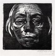 珂勒惠支的自画像远非仅是对自身外貌的简单记录,而是她艺术生涯中最具震撼力的作品之一。《正面自画像》也不例外。这幅画原本是为路德维希·凯默勒1923年出版的珂勒惠支专著所作的卷首插图,它以冷峻而令人难以忘怀的笔触,描绘了一位饱经悲痛的女性形象。珂勒惠支一生都在与抑郁症作斗争,但真正给她留下难以磨灭的伤痕的,是第一次世界大战爆发初期儿子的不幸离世。悲痛和无法挽回的失落感贯穿了她的日记和信件,即使在她晚年,这种感受也如同1914年一样鲜明。她那刻骨铭心的痛苦深深烙印在她作品的每一笔之中。直到1920年,她才发现了木刻这种极具感染力的全新艺术媒介。在那年6月25日的日记中,她写道:“昨天……我看到了一些令我震惊的东西:巴拉赫的木刻版画。今天我又看了看我的石版画,发现几乎全都不行……我再也做不了蚀刻版画了;我彻底放弃了……我应该像巴拉赫那样,重新开始创作木刻版画吗?……在木刻版画方面,我不想迎合现在流行的点状效果。我想要的只是表达……”