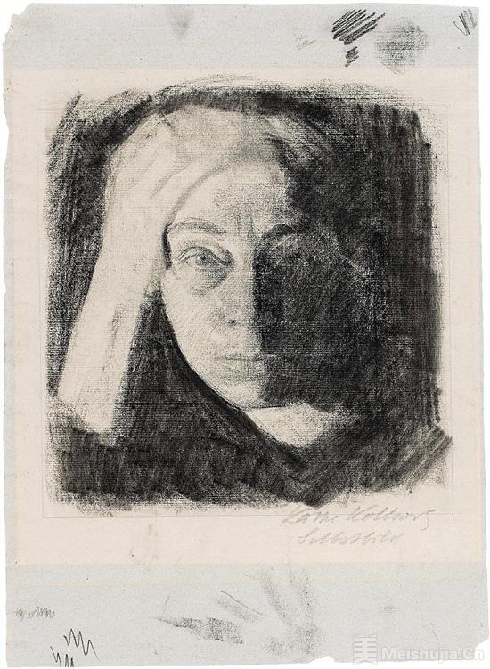 她的《正面自画像》(约1910,炭笔画于灰蓝色安格尔纸上,NT 68)展现了艺术家最钟爱的姿态——一只手臂搭在桌上,一只手托着额头,凝视着镜子,专注地作画。在她的素描和版画作品中,艺术家反复以这种沉思、探索和自我反思的姿态描绘自己。甚至像雨果·埃尔福特这样的摄影师也经常捕捉到凯绥·珂勒惠支的这种姿态