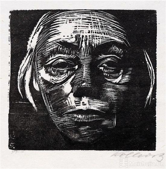 (3/3)凯绥·珂勒惠支 正面自画像 41.7×30.4cm 图像尺寸14.8×15.5cm 自制米色纸 木刻 1922-1923年 加拿大国家美术馆藏