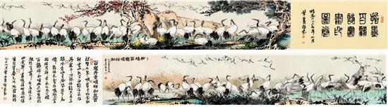 第二次尝试在1989年末,是一幅高0.5米、长5.9米的指墨《百鹤图》,卷首由陆俨少先生题字。长卷气象初显恢宏,鹤数大增,松石梅竹渐成体系。