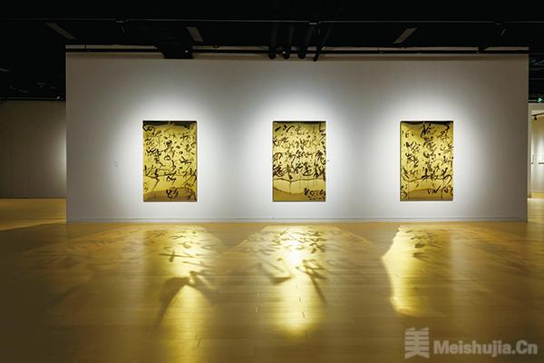 除上述大型作品外,本次展览中还有一批草书作品。这些作品虽难以逐字释读,但线条流畅飞动、墨色层次丰富、结构开合自如,在延续传统草书气韵贯通的美学原则的同时,极大强化了视觉节奏的表现力。此外,入口处三幅从顶垂地的长幔,以《诗经》篇章为文本内容,以水墨书写贯穿而下,形成一道既具古典诗文意境又充满当代装置感的视觉屏障。