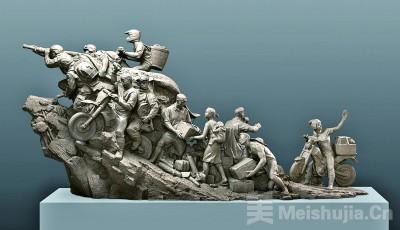 “两个现场+两个空间”的学习,为同学们的创作打下了坚实的基础,而距离真正完成一件场景雕塑作品,还需要创作者充分发挥其想象力与共情力。“场景雕塑”课会重点聚焦革命历史题材雕塑创作,在进行多方研习与考察后,老师先抛出相关主题,并让同学们围绕该主题发挥想象,罗列出“情绪关键词”。如在一次以“南昌起义”为主题的雕塑创作中,一位同学在设计之初列出了“激烈”“昂扬”“力量”“信心”等关键词。接下来,老师便会引导同学将这些复杂的情绪具象化,如跃起的战士代表“激烈”,高举的大刀象征“昂扬”,健硕的战马彰显“力量”等。同学们以此思路绘制草图,重点经营正视面的构图,并以大小不一的泥方块和泥条搭建出作品的空间关系,最终逐步调整为一件完整的场景雕塑。通过这样的训练,雕塑作品的内在情绪与外在形象得以深度融合,不仅具有生动的视觉效果,更能精准传递出丰富的情感内涵。