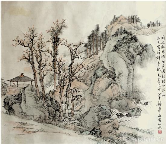 潘韵先生(1901—1985),浙江长兴人。年轻时兴趣广泛,除了酷爱书画艺术之外,还爱戏曲、琴、棋等,他曾给自己取名“趣琴”,晚年又取号“趣叟”,1933年考入上海新华艺术专科学校,毕业后留校任教。1938年,由于抗日战争全面爆发,新华艺专内迁,几年后经潘天寿先生的推荐,任教于杭州艺术专科学校。新中国成立后,他又跟随潘天寿先生在中央美术学院华东分院(后改名浙江美术学院,今为中国美术学院)执教,潘天寿先生赏识他的传统绘画功力,曾说潘韵先生是很适合讲授山水画基础课的老师。由此,潘韵先生在美术学院教学达四十余年之久,还为美术学院国画系留下了一批山水画范本。许多当年就读于美院而今功成名就的山水画家,都曾受惠于潘韵先生传统法度的教诲。