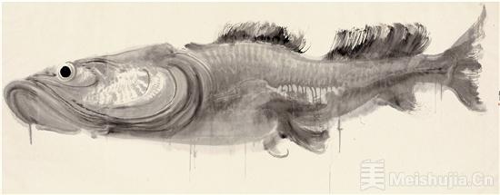 在这组鱼系列的探索中,周京新打破了原有的创作方式,画材上也带来了全新的变化:改变了以往研墨的习惯,以瓶装墨汁取代;纸张替换成不易吃墨的厚纸;墨盘也升级成容量更大的深墨盘;甚至连新开的大毛笔都带点玩味,笔中像是藏了颜料匣,时不时褪色给画面带来忽蓝、忽红的意外之色。周京新笑称:“相当于穿上一双新的鞋子,配上新的装扮去旅游,爬没有爬过的山,渡没有蹚过的河,就是那种感觉,还挺有趣的。”