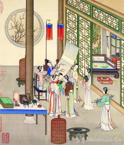明代文震亨的《长物志》谈到不同月份当悬挂应景画作,仲冬宜观雪景、蜡梅、水仙等图。十二月令图像后来在清宫流行开来,单图可按时节使用。陈枚《月曼清游图》设计并描摹了四时夜晚贵族女性的消闲活动,因得乾隆帝激赏,还成为同名牙雕组画的蓝本。代表十一月的《围炉博古》中,一树蜡梅自月窗映入,众人或阅览古画,或把玩器物,其乐融融。一个配备熏笼的、精巧的铜炭盆置于地面,点明了画题。