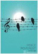比如中国作者何方、陈佳琪的作品《镌刻和平》,以深蓝底色营造庄重氛围,将“和”“平”二字以雕刻线条呈现,并融入蜡烛、白菊、青铜鼎等意象,庄重而富有形式感,呼应“以史为鉴、珍爱和平”的主题。中国作者林祝生的《和平乐章》颇显诗意:将战场警戒线化作五线谱,和平鸽栖息于上,仿佛在演奏一曲和平的乐章。