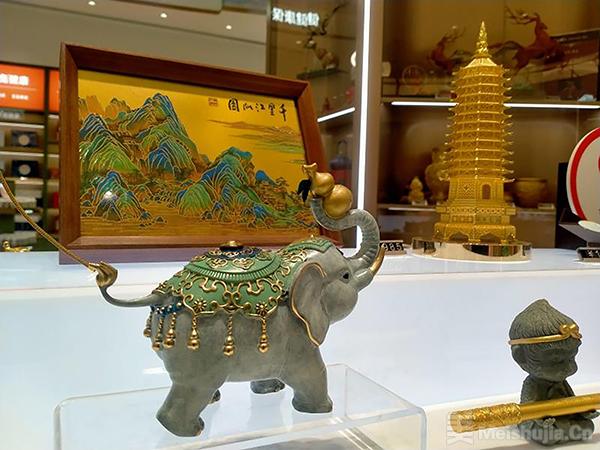 “朱炳仁·铜”专柜展示的千里江山图和文昌塔等铜艺文创品
