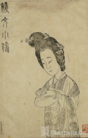 该本卷首“莺莺像”以篆书题作“双文小像”,人物面庞丰腴,衣着装饰华丽,手持含有象征意味的鱼龙玉环,发作高髻花簪的“唐妆”,头部比例显较常态为大,既看得出周昉一路仕女画的影响,又与陈洪绶传世作品的表现十分接近。此本另有根据曲文内容和意境所作的“曲意图”五幅,对应“西厢”五本,绘刻风格上与莺莺像也是同一的。这组版画历来被认定确由陈氏创稿,其后叶亦刊有“溪山老莲洪绶写于定香桥畔”的款署。