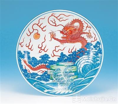 清康熙青花五彩海水云龙纹盘胎体坚致细白,通体施白釉,釉色白中闪青。整器以海水云龙纹装饰,器外壁用釉下青花绘云纹,釉上抹红绘龙,并用黑彩点睛。器内壁绘五爪龙穿行于云海之间,气势雄伟。底书“大清康熙年制”青花双圈二行楷书款。