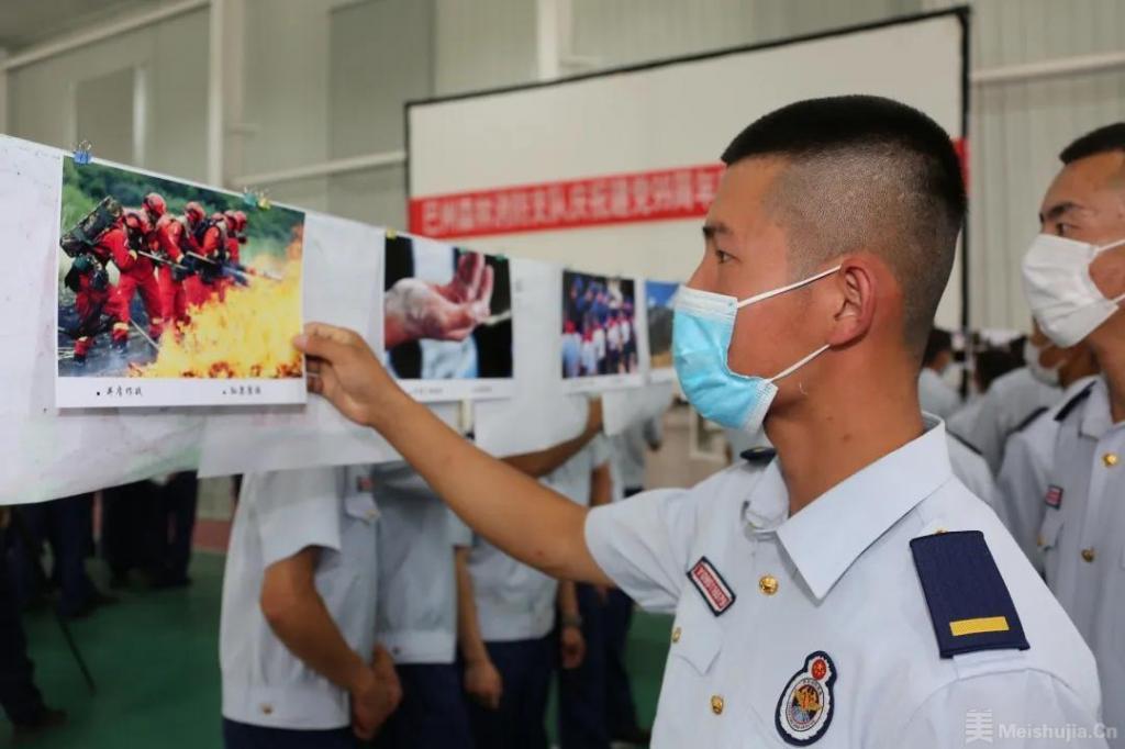 摄影作品以时代影像映照强队壮志,全方位、立体式地展示队伍加强政治引领、聚焦主业强本领、全面转制改革的昂扬状态和战斗风采。单照、组图、特写,一张张主题立意鲜明、审美视角独特、艺术个性凸显、表现语汇多样,以阳刚雄壮、大气磅礴的美学风格,真实反映森林消防指战员战斗训练、生活学习的生动画面,充分展示了国家队、主力军的良好形象和精神面貌,向建党99周年献上一幅热血与忠诚辉映的艺术长卷。“这张珍贵照片是我们在巴州轮台县国家级胡杨林保护区开展防火科普宣教活动时拍的,当时我们在‘胡杨王’下重温入党誓词,在党旗下接受心灵的净化与洗礼,牢记共产党员的政治责任和历史使命。”参展选手孙康康说。