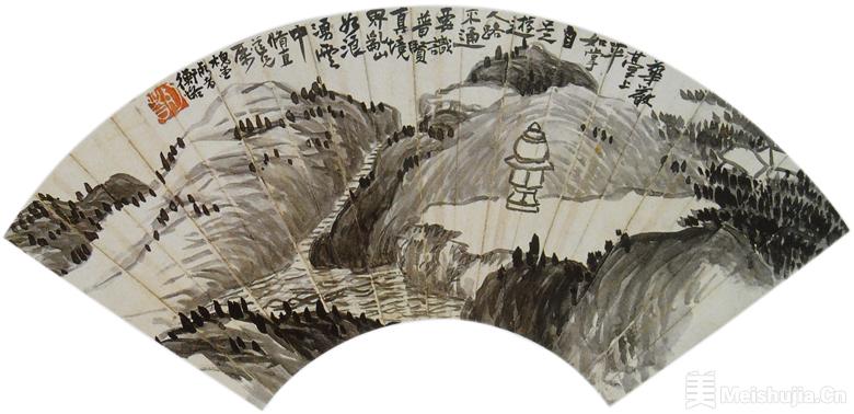 如图所示这幅陈衡恪先生扇面《华岩台图》,墨笔纸本。笔墨幽厚深邃,气格平中见险。流动的山泉,崎岖的石阶,华岩台上的舍利塔,与宁静幽坳的密林遥相呼应。上题一诗曰:“华岩台上平如掌,自是游人路不通。要识普贤真境界,乱山如浪涌云中。”画是送给一名叫“修直道兄”的,款落“槐堂朽者衡恪”。