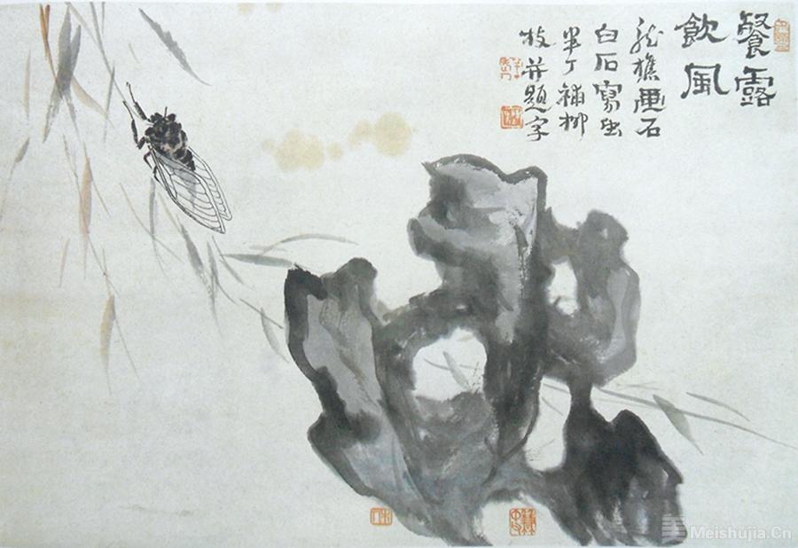 《餐露饮风图》(图1),设淡色。萧谦中首先开笔,写出的是没骨法“瘦漏透”的奇石,画笔清润,水墨交融,润中藏涩,笔墨玲珑有佳趣。白石翁写蝉一只,工占七,意占三,略施淡赭,知了生动可爱,极大丰富了构图的画龙点睛。半丁老人补柳并题字。寥寥两笔的杨柳,画得飘逸灵动,越发风雅荡俗。在三位大家中,白石翁年龄最长,半丁老人次之,“黑萧”最小。但他们都是画中挚友,相互礼让谦和,相交十分投机,在绘画上取长补短,从不计较皮毛得失。故而,可以看得出,三人笔墨的完美统一。整幅构图,虚实相间。猛使我想起首佚名诗:“知了知了复知了,杨柳枝头噪声早。催得田家收有成,鼓腹高歌醉安饱。”诗直逼画境!