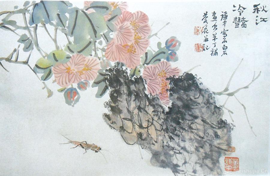 《秋江冷艳图》(图2),萧谦中在这块石头的创作上,采用的还是大涤子法。写出的是传统的云头皴或叫鱼鳞皴。笔道非常的随意散淡,奇逸有佳气。半丁老人也兴致很高,下笔刷刷几片大叶,颇见厚润大气。 穿行叶茎,密而不乱。几朵盛开的芙蓉,有的含苞待放,有的含羞藏于石中,有的绽放而迎风不惧,也有的避于叶后在窃窃私语。总之,画家画出了生活,写出了胸中的浩然之气。白石翁最后收笔,写出更绝,横竖两笔,就勾勒出一只活生生的昆虫,虫工中带写,以写为主,更与画面珠联璧合。在绘画上,我们总说,出笔一定要“胸有成竹”,而这三位画坛巨匠的胸中之笔,皆是“无成竹中而生成竹”。