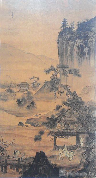李在这幅《松溪访友图》(见图),绢本设色,尺寸162×88厘米,“百缘堂”珍藏。一般古人绘画中的《松溪访友图》或《溪山访友图》的题材比较多,指的多是高士隐逸林泉的故事。深秋的高山峻岭,古柏苍松,意出奇势,烘托出画面的幽静。远山空蒙的亭台及若隐若现的房宇,深置仙境浩渺的云雾之中。骑马已过曲桥的儒雅文士,携带仆僮四人,兴兴来到多年未曾相见的旧友门前,急命随从轻声叩门,马前的左右小僮,表情神态各异,忠实挑担的老仆,正随后踽踽而行。画面笔势精整雄健,松风高壁峰峦秀拔,山涧溪水,潺潺流过。变幻云烟,仿似梦境一般。李在画中之笔,宗的是李成、郭熙一路细劲雄奇之风。