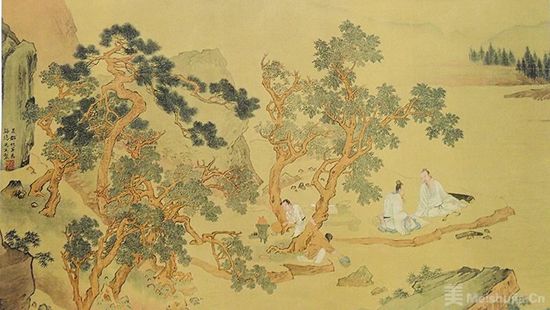 仇英这幅《松溪论画图》(见图),设色绢本,尺寸59.3×105厘米,吉林博物院藏。整图精整,远山近水,清润毓秀。奇峰怪石,皴擦自然有度。参差不齐的苍松,穿行于郁郁茂密的山林溪水间。溪旁高士抚琴谈天,树下书僮取水烹茶,看似好一阵轻松忙碌。文士一曲《高山流水》后,与轻松坐在对面的高士,正在谈论一幅名画。实际上,画面中的两位高士,我们应该都比较熟悉,抚琴者应该是文征明,长得清癯脱俗、儒雅风流;而对面盘膝坐着略有沉思者,可能就是仇英自己。厌烦了城市间的喧嚣之气,大自然的青山绿水让心中的浊气一吐为快。溪水松风的空旷清远,让胸中的画语,多了许多道不尽的云烟真气。