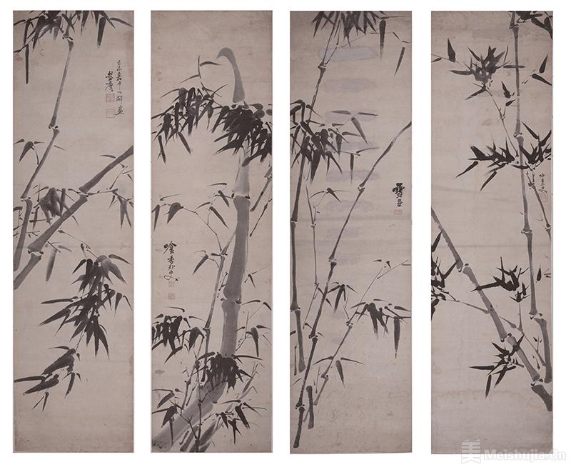 这组墨竹四条屏,以淡墨逐渐画出竹竿,以稍墨出节,顺节而出枝,后以墨笔挥就竹叶,虚实相映,如灯取影,不任茎叶和繁枝,运笔均匀,粗细有致,染墨浓淡相宜,明暗凹凸分明,层次丰富,节奏和谐,充分表现了俊逸之态,又能够体现出作者的艺术修养和艺术品位。