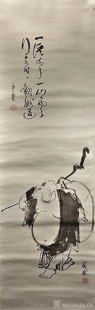 如图所示是胡璋绘制画心的一幅日本茶道用挂画。画上有东瀛人水上寒堂题句:“一溪流水一山云,行处时时观妙道。”题句与书法俱不俗。但璋画此还是取我中华之禅意:“行也布袋,坐也布袋,放下布袋,多少自在。”正所谓茶禅一味,包袱背得太多,人活得就累,该放下时须放下。古今多少豪杰,身后千古大业,不都作了渔樵闲话?繁华事散逐香尘,青史留名又待如何?都不如座前的一壶好茶,叫人气定神闲,好生自在。