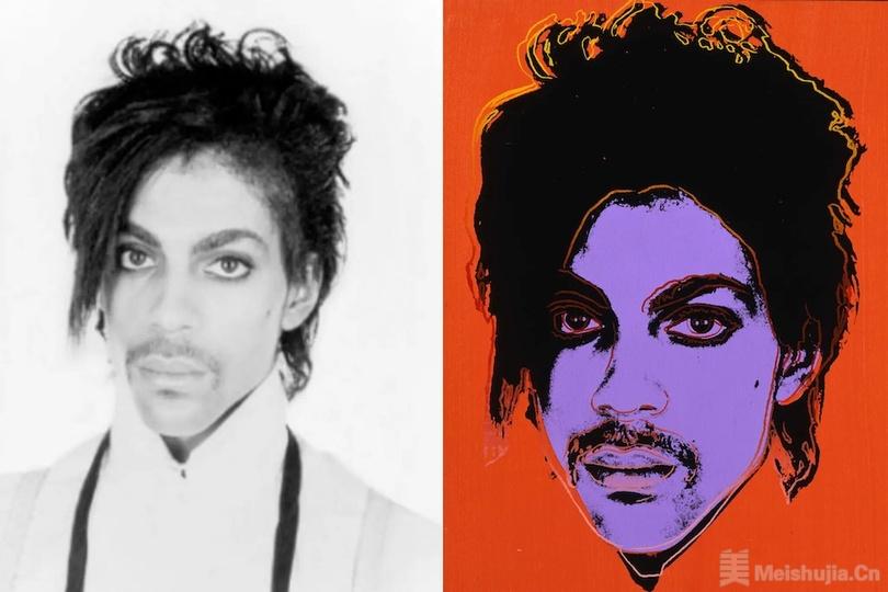 左:林恩·戈德史密斯1981年拍摄的Prince肖像照. 右:安迪·沃霍尔1984年的作品.