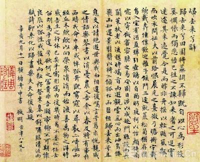 第四阶段——宋、元至明代前中期,书法本体形式与内涵的扩展阶段。在此阶段,书法艺术作为文人的一种精神生活方式为人们所喜爱。在古典的基础上,人们试图探索更为丰富的书法艺术形式,以增强其表现力;这时来自哲学、文学、绘画、音乐等方面的滋养被不断注入书法艺术之中,大大丰富了中国书法作为艺术的内涵,同时也极大地提升了书法在中国传统文化中的地位。如果说隋唐五代是尚法的时代,那么宋代书法则以一种尚意抒情的面目出现。无论是天资甚高的蔡襄还是自出新意的苏轼,或是雄视古人的黄庭坚抑或萧散奇险的米芾,都力图通过自己的书作凸显出标新立异的姿态,并使其学问文章之气发于笔墨之间,进而产生新的审美意境。