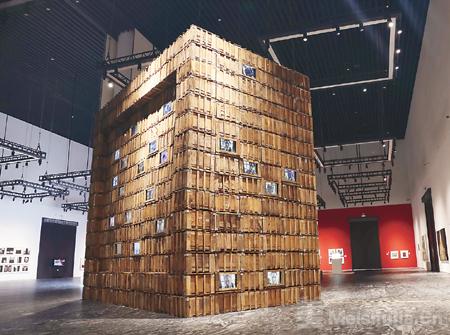 展厅中,一件名为《众声之声》的装置将观众的视野带回到2014年,应天齐在家乡芜湖发起的“万人捡砖”艺术活动。当时居住在芜湖古城的居民每个人捡起一块废墟中的城砖,写上自己的名字,封存在整齐堆放的箱子中,以此来呼吁芜湖古城的遗存保护问题。如今,这些木箱正在以装置的形式呈现在人们眼前——152个实体木箱组合成巨大的箱体造型,其中34个木箱上视频播放着芜湖市民的现场留言动态影像。木箱是承载市民捡砖活动的现成品,视频回放着当年捡砖人留下的依依心声,强烈的视觉冲击力之下是芜湖古城居民的眷眷深情。