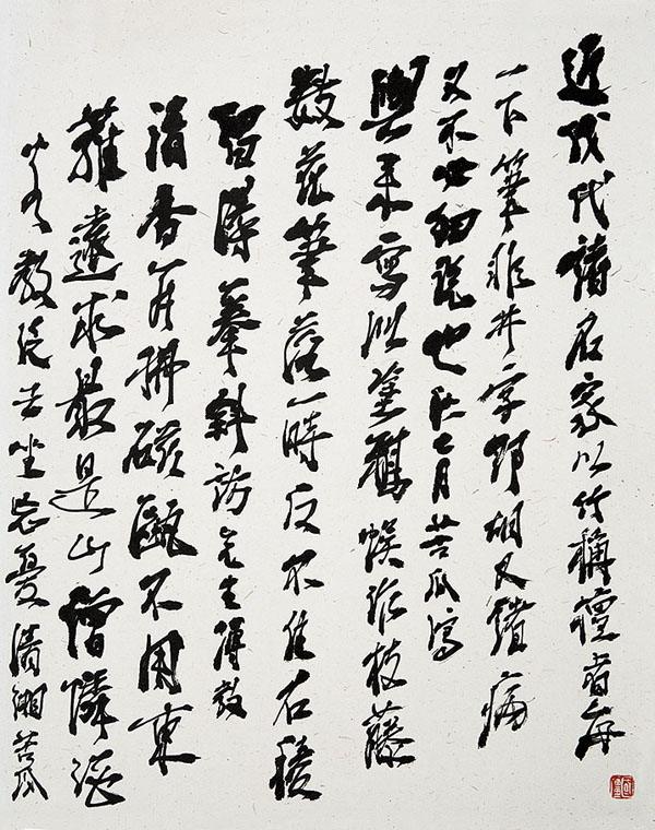 第一次见陆先生,我是相当紧张的,就像是要去见一位心仪已久的美女,虽说画如其人,但毕竟不知底细,不知是否容易亲近。与陆先生面对面坐,我竟不知寒暄,先蹦出一句“请先允许我向您表达我的敬意”,陆先生则淡然一笑,想必他更不明了我的底细。就从这一面开始,我与陆先生开始了短暂但颇有深度的交流,他的随和和洒脱让我打消了顾虑,肆无忌惮起来。我时不时出现在他的画室里,看他画画写字,喝他的茶,抽他的烟,吃他的饭,想了解他的方方面面。更重要的,吐露着我憋在心里多年的各种看法,挖他的思想。我以为中国大写意画,不仅需要画家对笔墨造型有高度抽象的天赋,更需要画家在思想立意层面,有对中国哲学文化中的根本问题有深刻认识,才不致流于俗套。于是我们的闲聊从有关大写意画的精神、中国绘画画理、书理、西方艺术、中西文化艺术差异、对艺术的追求,到有关哲学根本问题的探讨,道家、佛家思想及艺术的本质问题等等。我承认我有些或深或浅,或成熟或浮浅的关于上述问题的看法,无奈才疏学浅,每论及艰深处总觉词穷。而陆先生总能娓娓道来,不堆砌词藻,不搬弄典籍,借生活中各种各样的例子,打各种各样的比方,往往将艰深的问题化解于浅白,比如用造房子喻画理,用古人造长城之法喻如何顺乎自然,用醉酒汉走路喻书理,用张三丰太极拳喻学画……谈到会心处,更是手舞足蹈,各种比划,至真至性如此!我猜大概是他以为我听不懂吧,其实我也会心了,心里暗暗叫好。
