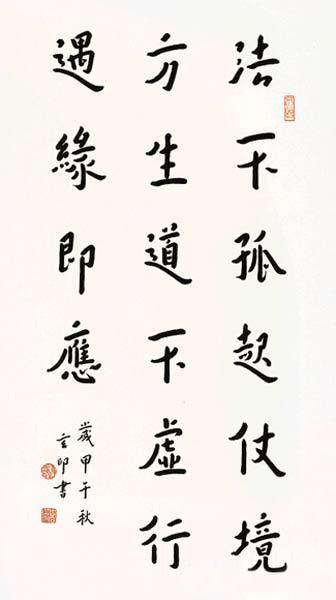 法师诸体皆擅,无论楷书、隶书、魏碑、行书、草书都个性鲜明。如果对其书法作研究的话,我以为他的楷书、行书最能代表其艺术成就。楷书严谨工致,若束缚很多,情性就会减弱。而能把楷书写得精到又有个人风格实在很难,何况现今社会人心浮躁,真正能够静下来进行深入研究的书家太少了,很多有天赋的书家亦难忍受单调寂寞之苦而半途废退,唯法师孜孜以求,奋勉其中。上至汉魏晋唐下至宋元明清诸家,法师无不涉猎,且法师又积淀书外潜心修学,从古今文学史、美术史、书法史论到佛学经藏无一例外,写出了大量学佛感悟,学书随想和诗词歌赋。法师常说『比之佛法大道,书法实乃末枝,悟道之路尚远……』谦逊儒雅,温润而不乏率真,此一佛门书家矣。