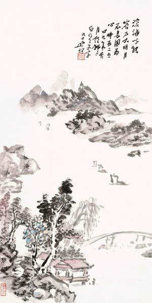 法师早年学书习画,上追贯休、巨然、米氏父子、吴道子、梁楷、法常、吴镇、黄公望诸家,下承弘仁、髡残、八大、石涛、担当弘一、黄宾虹诸师。人物、山水、花卉俱精,尤以佛像人物最著。法师笔下的佛像,早年清净淡远,神态安详端庄,下笔洒脱自然,且法度森严;晚年简笔画佛,老笔纷披,古拙安详,笔墨简之又简,廖廖几笔,形神兼备,意蕴深厚高远,禅意十足。王国维人间词话有:言气质,言神韵,不如言境界,有境界,本也,气质神韵末也。有境界而二者随之矣。故师之晚年简笔人物、山水画的呈现,奠定了其高标独帜的艺术风范。法师画佛,不以高妙的笔法去表现,从清净心中流出,尤以神韵境界取胜,使人观之心静,能荡尽心中烦恼垢秽,使人心情恬朗。
