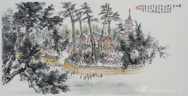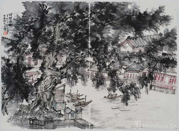先生画风清润,设色文雅,满纸书卷气。不去寻求壮怀激烈的北方豪情,唯独偏爱吴侬软语的南方柔美。风起太湖的一组江南写生作品,灵秀飘逸,墨色氤氲,无论园林、古寺、水乡、太湖在他笔下信手拈来,好像与之早有灵犀,其笔墨表现江南风月没有任何违和感,好像是老朋友见面。画面轻松自然,枯润相融,干湿相间,古树苍郁,湖石灵动,亭台楼阁掩映其间,一派江南好风光。其江南写生作品画出了自己独到的“风塘感受”。